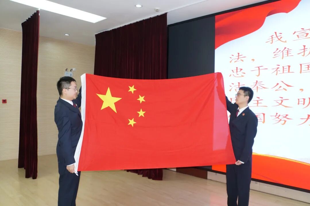 全体人员面向国旗列队肃立,高唱中华人民共和国国歌。李潇同志手抚宪法,右手举拳,领诵誓词,全体人员庄严宣誓,铿锵有力的誓言传递出新时代检察干警对宪法的尊崇与敬畏,更彰显了维护公平正义的坚定决心。